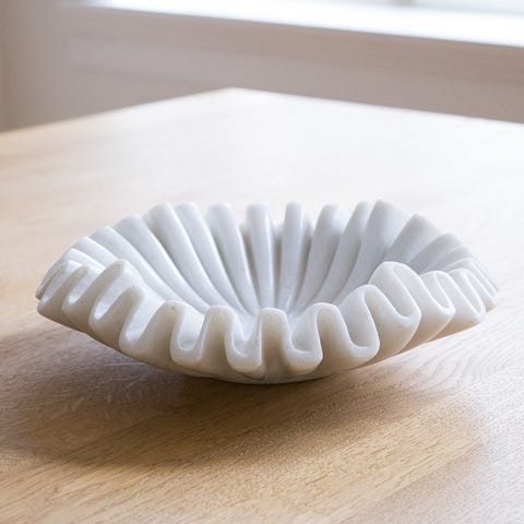 Fatet har et dekorativt, bølget mønster langs kanten og en høy fot, noe som gir det et unikt utseende. Egnet til dekorasjon i hjemmet.