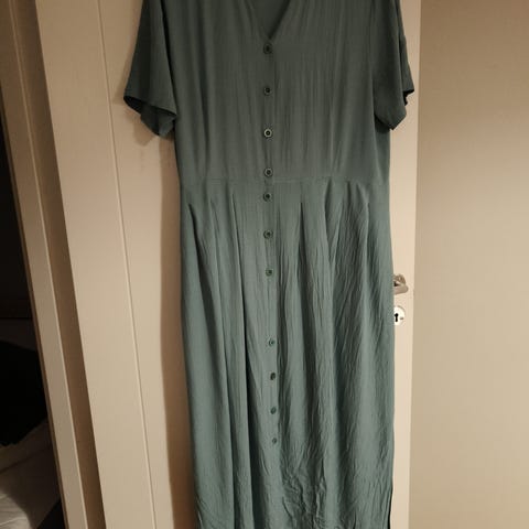 Florlett, gjennomsiktig maxi skjortekjole fra Lindex i størrelse L. Svart i bunnen, med grønt og hvitt blomstermønster. Underkjole medfølger ikke.