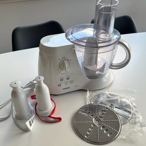 Bosch MUM Serie 2 kjøkkenmaskin med flere tilbehør som inkluderer blender, visper, rivjern, og sitruspresse. Maskinen har en hvit farge og er designet for allsidig bruk i matlaging og baking.