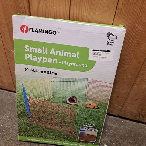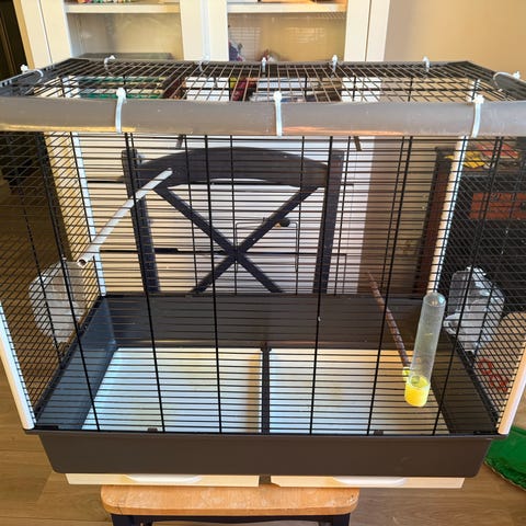 Ferplast hamsterbur laget av metall og plast. Egnet for små gnagere som hamstere. Buret har en hvit plastbunn og svart metallgitter. Passer til bruk som bolig for kjæledyr.