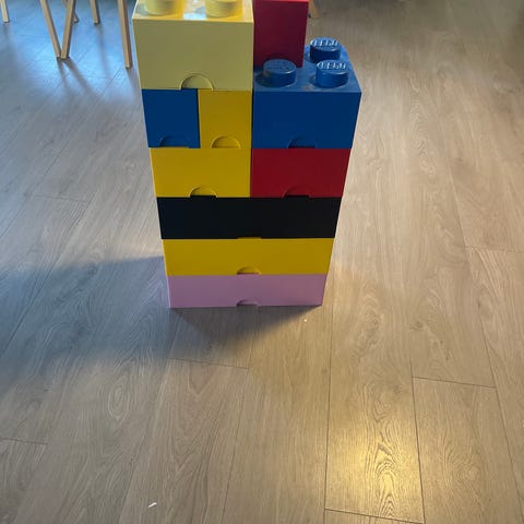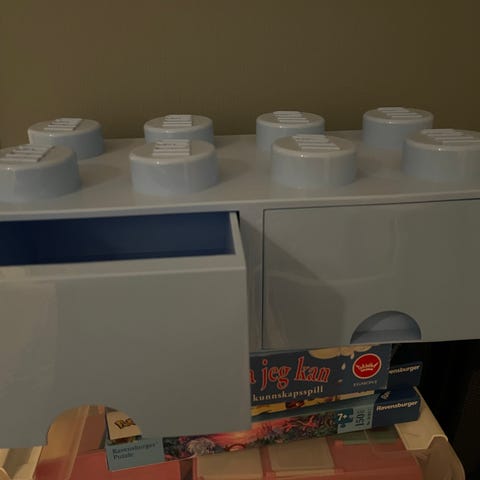 7 stk med lokk du løfter opp, og 1 stk (grønn) med to skuffer.