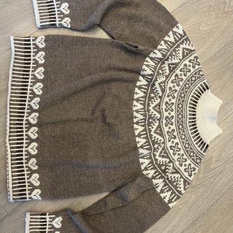 Den ble dessverre litt for stor for meg, så den er så og si ubrukt! Den er strikket i en str S, men syntes den passer en M bedre! Men kommer helt ann på om man liker den oversized eller ikke!