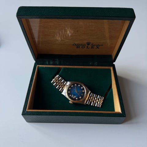 Rolex Datejust 16013 1987-modell. Klokken har en kombinasjon av gull- og rustfritt stål med gullfarget urskive og datoindikator. Inkluderer original eske og sertifikat fra Freya Jewellery. Klokken ble gjennomgått av urmaker ved salg fra Freya i 2024, med ett års garanti. Klokken trekker og går som den skal. Følger med to ekstra ledd. Har 100 GG-referanser fra klokkesalg. Forhåndsbetaling, sendes EON eller NP med sporing.