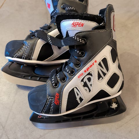 Ishockeyskøyter for barn i størrelse 27-30 (regulerbare). Den ene skøyten er litt slitt oppå foten, se bildet.