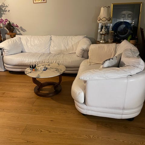 Skinn sofa med to lenestoler og en puff. Godt brukt.