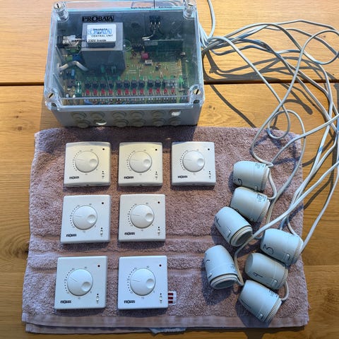 Nytt fordelingsskap med ramme og wirer for snøring av varmerør. Kun tatt ut av eske for inspeksjon, ikke vært montert.