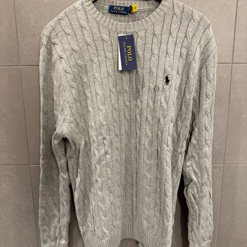 Ralph Lauren Polo genser i blå farge, laget av bomull. Genseren er i størrelse L og har et kabelstrikket mønster. Den har rund hals og lang arm.
