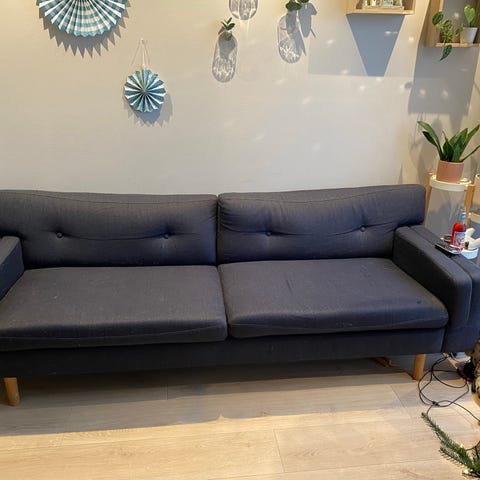 Fin og god sofa gies bort. Må hentes og bæres selv. Bor i 2 etasje i 4mannsbolig. Gies bort fordi katten har klort på noen av ytterhjørnene.