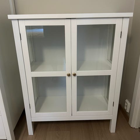 IKEA vitrineskap med glassdører i aluminiumsramme. Skapet har to dører med håndtak og er designet for oppbevaring og visning av gjenstander. Passer til bruk i hjem eller kontor. Er laget for å henges opp på vegg. Pris kan diskuteres.