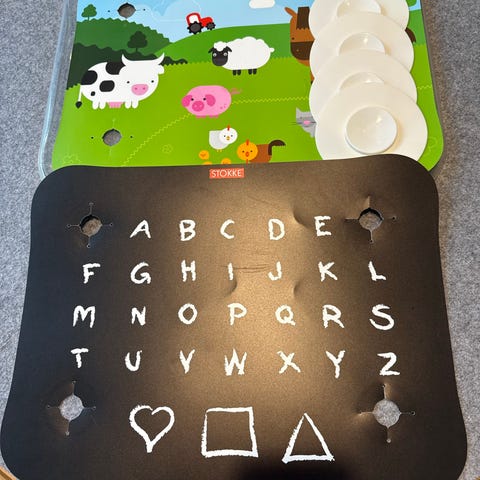 Stokke høy barnestol med sete og fotstøtte i tre og ramme i metall. Designet for barn og gir støtte i flere høyder for tilpasning til barnets vekst. Stolens materialer inkluderer tre og metall, og den har en stabil konstruksjon. Trenger et strøk maling eller to. Har stått ute i en stund , derfor litt slitt.