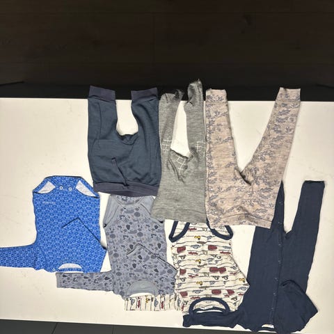 En liten klespakke med 2 ullsett fra Hust&Claire i str. 62 til en gutt. Omslagsbodyer og bukser i ull/bambus, som er en god alternativ for sensitiv hud.