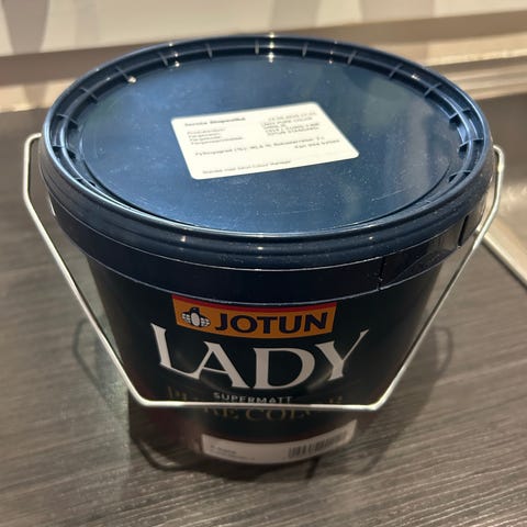 Jotun Lady Pure Color Supermatt i farge Welcoming Red 20167/4429-Y72R 0,5 L. Kjøpt på Jernia Thorstensen 03.01.2026. Bare brukt til å male en 30x30 cm fargeprøve på vegg.