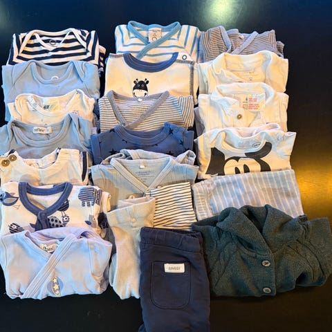 Pent brukte babyklær, 5 T-skjorte bodyer, 1 singlet body og 1 shorts.