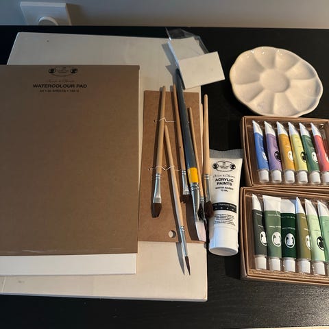 I also have a third set of half used paints as a free bonus. These are not good for small kids, these paints stain and do not wash off. They are good for an older child or adult who wants their artwork to last.