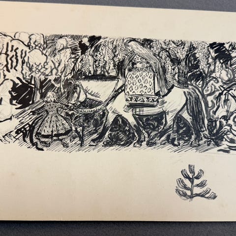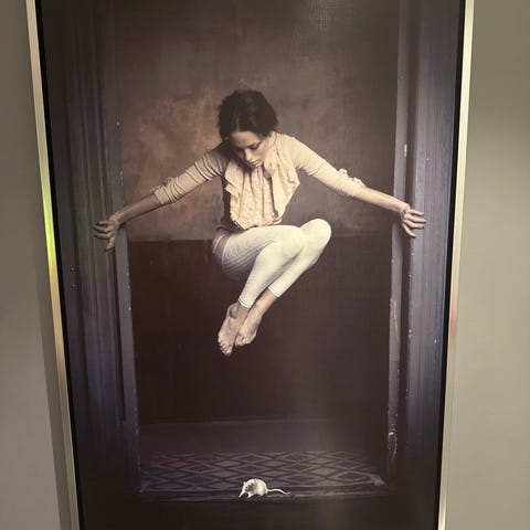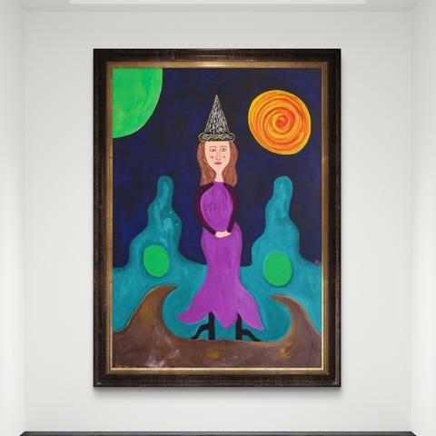 Veggbilde som viser profil av kvinne med fjærpryd i håret. Bildet har mørk bakgrunn og detaljerte farger i fjærene.