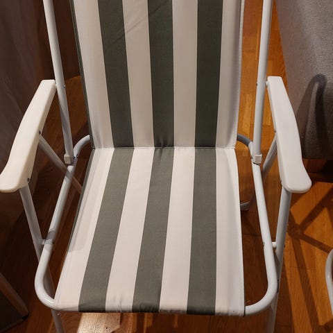 Sammenleggbare campingstoler med koppholder. Kun tatt opp og prøvd. Ikke brukt siden. Kjøpt på Rusta. Til voksen. 2 stk selges samlet. Kr. 100,- pr stk. Kr. 200,- samlet.