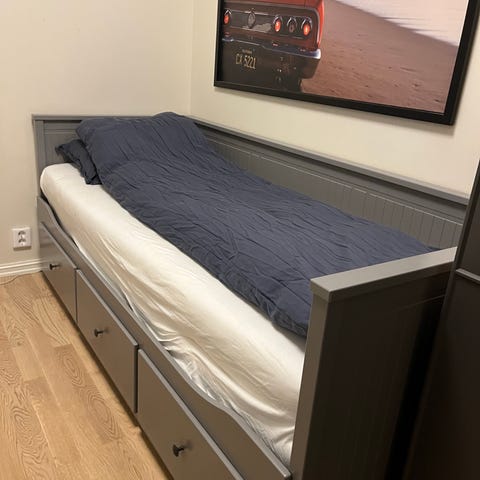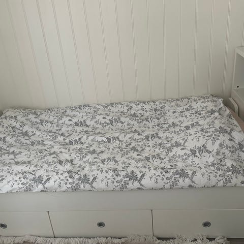 Hemmnes uttrekkbar seng med praktiske skuffer. Kan følge med to madrasser pluss en overmadrass.