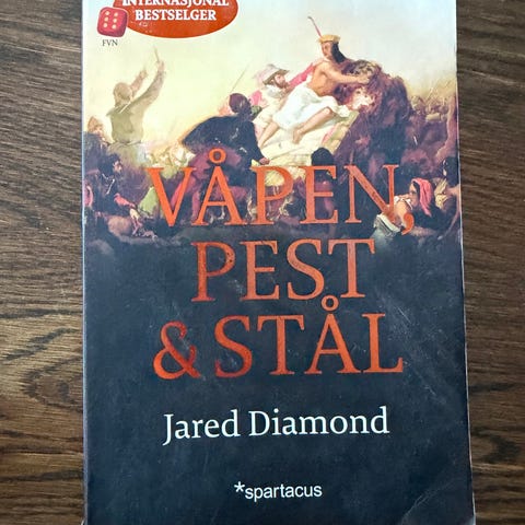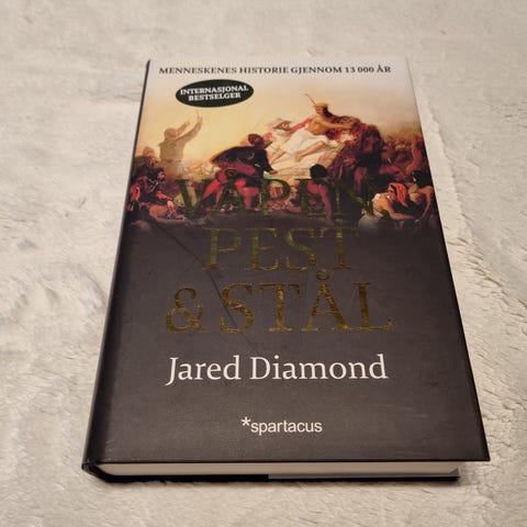 Jared Diamond: Våpen, pest og stål. Menneskets historie gjennom 13000 år. Spartacus 2011. Boken er innbundet og har omslag, små bruksspor. Illustrert med fotografier og kart. Kan sende.