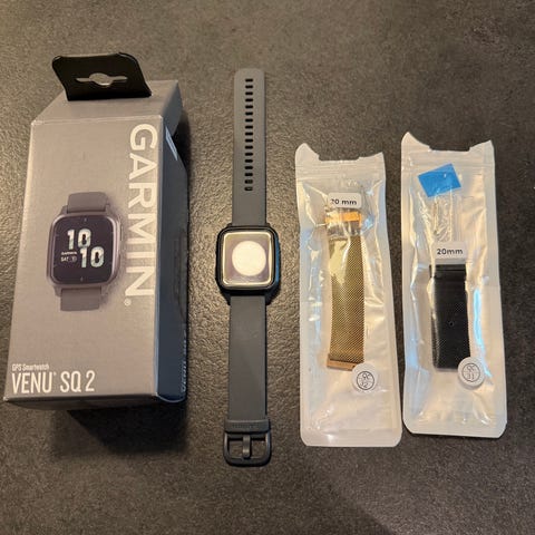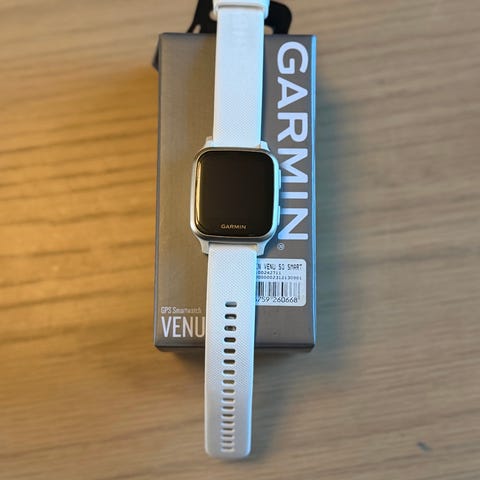 Garmin Venu Sq 2 smartklokke i hvit farge. Klokken har en rektangulær skjerm og hvitt armbånd. Passer til bruk for både trening og daglig aktivitetsovervåkning.