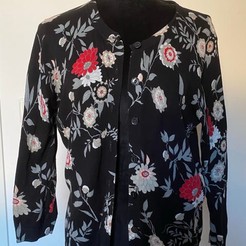 Selger en klespakke med noen topper, og en cardigan i str S/M. ( liten nupp på denne, se bilde)Obs: den sorte pen jakken er str XL men veldig liten i str. passer fint en S/M. Hele og fine plagg☺️