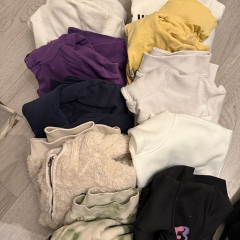 Sett med klær til gutt i størrelse 146/152 gensere og bukse 158. bestående av to hettegensere og en bukse. Hettegenserne har hette og ulike mønstre i grå og blå farger. Buksen er beige/brun med lommer.