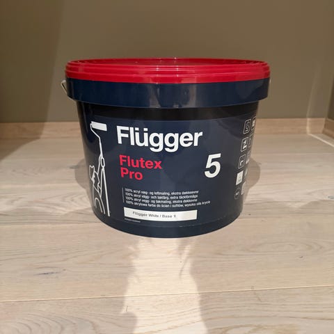Selger uåpnet 10L spann Flügger Flutex Pro 5 maling i fargen KOKOS. Egnet for innendørs bruk. Produktet har god dekkevne og slitestyrke.