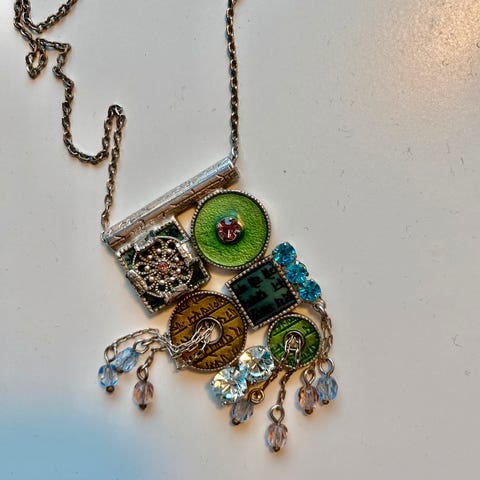 brosje, vintage smykke, 1950-tallet, 1956, håndmalt, blomsterbrosje, retro, kunstsmykke