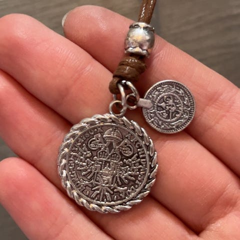 På baksiden er årstallet 1956 påmalt. Baksiden er i metall med klassisk nålefeste. Det er noe naturlig aldersrelatert slitasje og patina på baksiden, i tråd med alder, men nålen fungerer som den skal. Forsiden fremstår hel og pen.