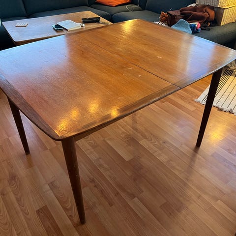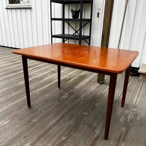 Veldig fint og solid spisebord i teak. Bordet er i veldig god stand med tanke på alderen, men litt olje kunne nok gjort det enda finere!