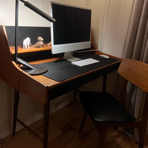 Selve bordplaten og hylleplatene har fått merker, vannmerker etc, og kan trenge litt omsorg.