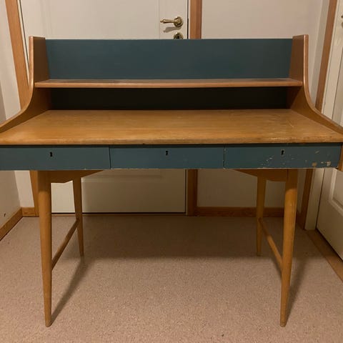 Klassisk Ola-Pult med orginal hylle. Pulten har 3 skuffer. Har nøkkel.