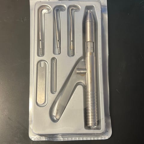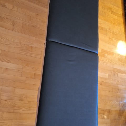 Gynekologisk undersøkelsesstol med svart polstring og justerbare benstøtter. Stolen kan justeres for pasientkomfort og undersøkelsesbehov. Materialer inkluderer metallramme og polstret sete for støtte og komfort under gynekologiske undersøkelser. Selges hbo 250 kr