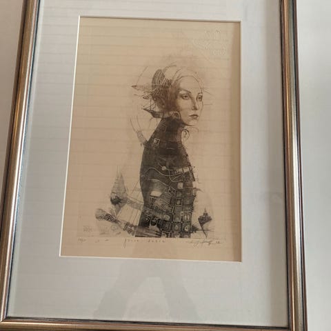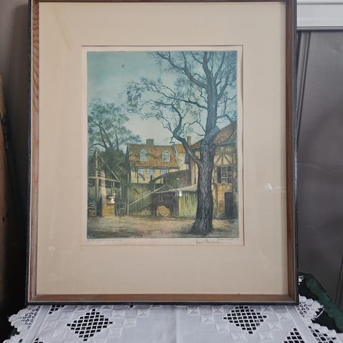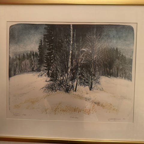 Arent Christensen kunsttrykk som viser et landskap med fjell og hytte. Bildet er innrammet med en enkel, gullfarget ramme. Passer til veggdekorasjon i hjem eller kontor.