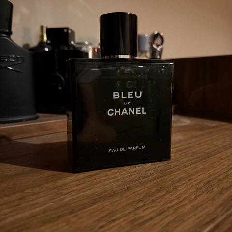 Chanel Bleu de Chanel Eau de Parfum. Parfyme i flaske med mørk blå farge og sort hette. Leveres med original emballasje
