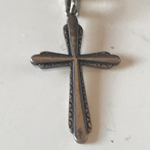 Antikk ustemplet sølv kors med gammelt sølvkjede. Korset har bruksspor i form av små riper og noen få bulker. Mål på korset er 59,8 x 35 x 2,8 mm. Kjedet er fullstemplet og har en lengde på ca 47 cm og bredde 2 mm. Vekt totalt er 9,3 gram.