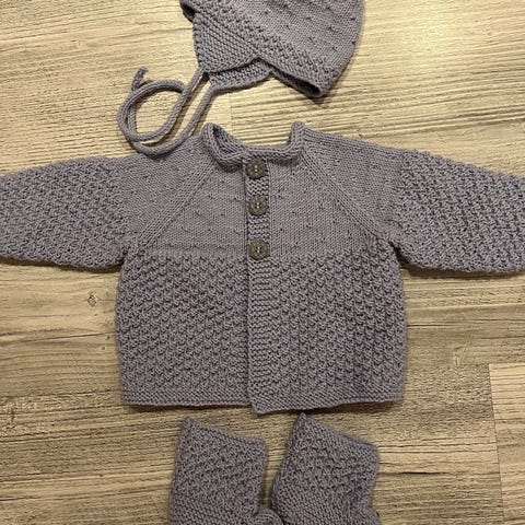 Sett strikket i str 0 .Trend merino petit garn- ekstra fint og mykt /lett merinoull. Nyvasket med milo på ullprogram 30 grader. Skyllemiddel skal ikke brukes.Røykfritt miljø.