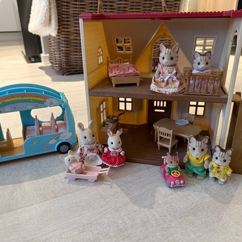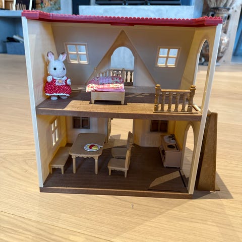 Helt ny i uåpnet boks. Sylvanian Familie lekehus med lyseblått tak, med flere rom og møbler. Inkluderer blant annet en kaninfigur med kjole. Huset har trapp, balkong og møbler.