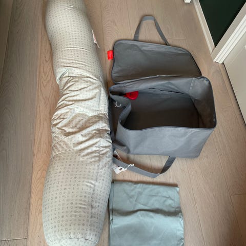 Bbhugme ammepute i lys rosa farge. Pent brukt til ett barn i to måneder. Kjøpt ny i 2023. Trekket er nyvasket. Oppbevaringsveske følger med.