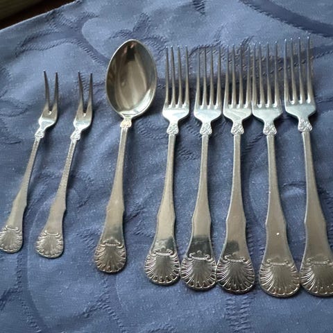 Dronningsølv, 830 gr selges. Gaflene måler 20 cm og skjeene 19 cm så de er store og tunge. Har brukt de som serveringsbestikk. kr. 800,00/stk. Koldtgaffel kr. 400,00
