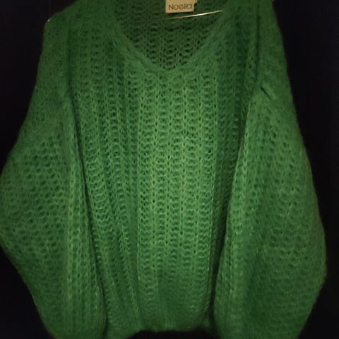 Agadir genser til salgs. Genseren er strikket i Gann garn Kid Mohair. Myk og god. Overvidde 112 cm, hel lengde 63 cm og ermelengde 47cm. Strikket med dobbelt garn. Bolen i farge lys bringebær og hvit, ermene i mørk pastell og hvit. Salgspris 900+ frakt.