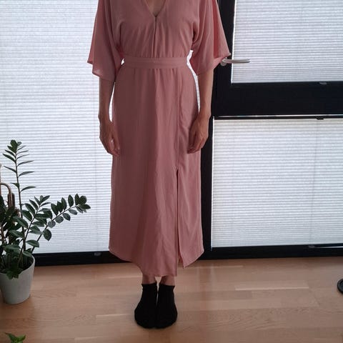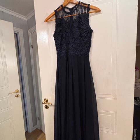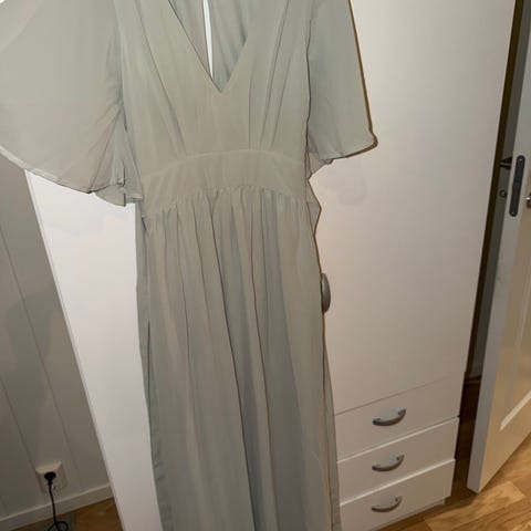 Maxikjole. Lysere og mer korallfarget i virkeligheten. Ble kjøpt til en bryllup men ble dessverre aldri brukt. Passer også en S da den er løs i modellen