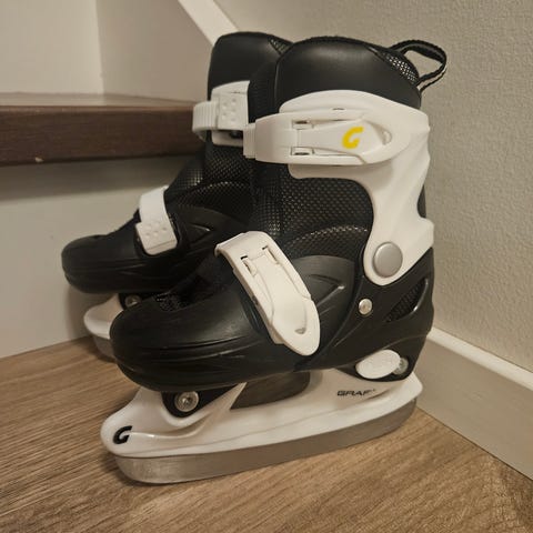 Uttrekkbare skøyter i str 34-37. Ubetydelig brukt, men har noen få bruksmerker. Blant annet et merke foran på høyre skøyte, se bilde. Kun brukt et par ganger.