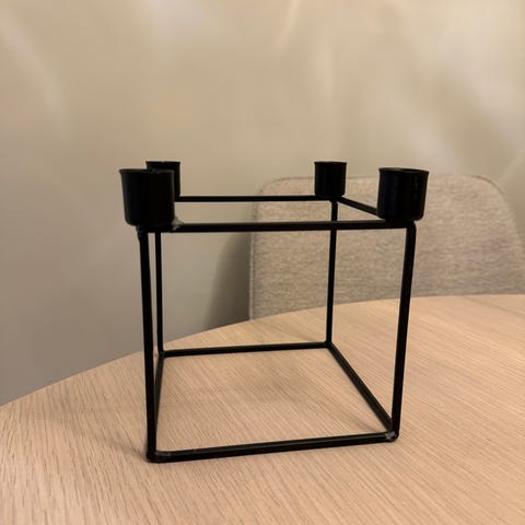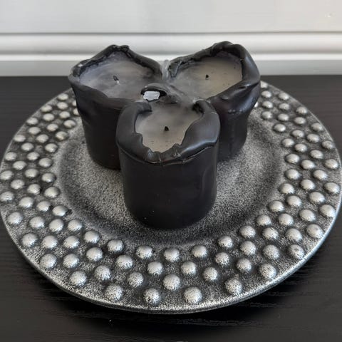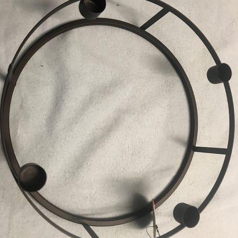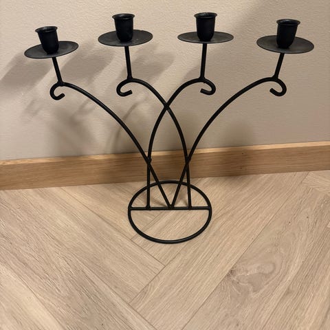 Selger en rundt, svart lysestake med omkrets 21cm. Brukt kun i adventstiden av oss, men vi har nå fått en ny. Forsøkt å rense den godt og det er kun litt stearinrester igjen.
