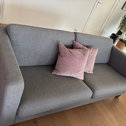 Sofaen er pent brukt her i hus. Kjøpt brukt på finn. Ble kjøpt med solskader i ryggputene, noe som ikke er synlig når man har snudd de (se til bildene).