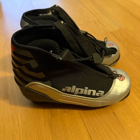 Fine skisko fra Alpina. Størrelse 34. Gode og varme. Knyting med trekk utenpå slik at de kan strammes godt uten å få is på lissene.
