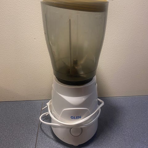 Blender gis bort. Godt brukt men funker enda. Mulig litt lekkasje i den ene beholderen.