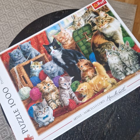 Trefl puslespill med 1000 biter som viser et motiv av varmluftsballonger over et landskap. Puslespillet er laget av kartongmateriale og egnet for voksne og barn