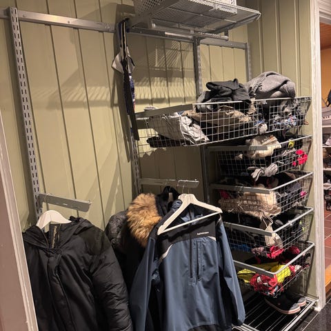 Selger hele elfasystemet med hyller, veggfeste og skuffer/knekter. Ps: knaggrekken på vegg til høyre følger ikke med.