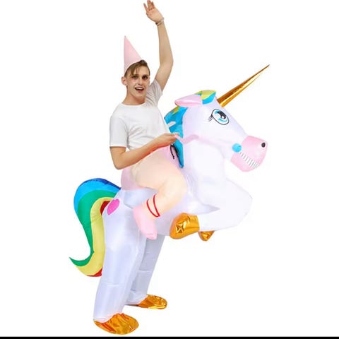 Selger et kjempekult oppblåsbart enhjørning kostyme. Passer voksne eller barn fra ca 12 år og oppover. Kun brukt 1 gang (Halloween 2025). Som ny.