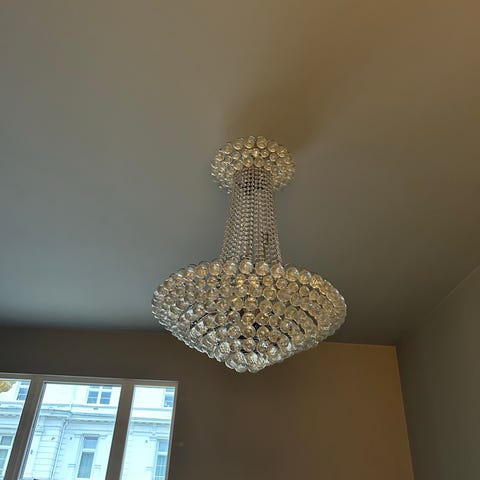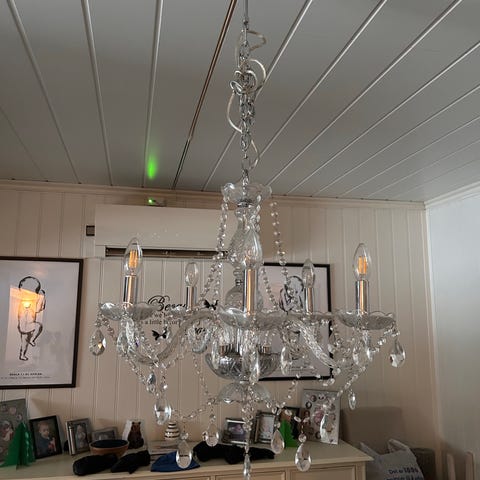 Lysekrone med dekorative krystallglassdetaljer. Passer til oppheng i tak og gir et klassisk uttrykk i rommet. Materialet består av glass og metall. Lyspærene følger med.
